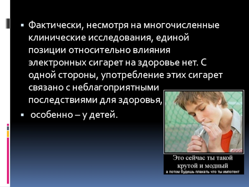 Слайд 15Фактически, несмотря на многочисленные клинические исследования, единой позиции относительно влияния электронных