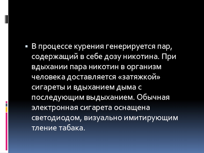 Слайд 4В процессе курения генерируется пар, содержащий в себе дозу никотина. При