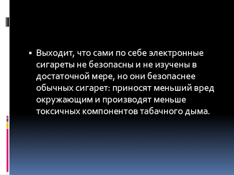 изучены в достаточной мере, но они безопаснее обычных сигарет: приносят меньший вред окружающим и производят меньше токсичных компонентов табачного дыма.