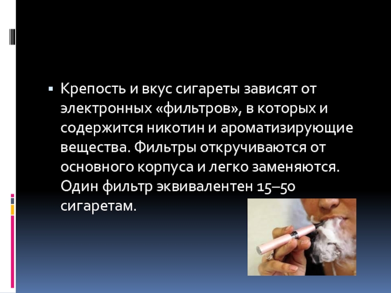 Слайд 5Крепость и вкус сигареты зависят от электронных «фильтров», в которых и