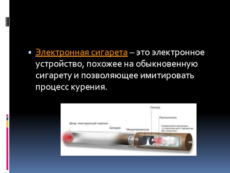 Слайд 2Электронная сигарета – это электронное устройство, похожее на обыкновенную сигарету и позволяющее