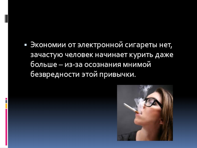 Слайд 9Экономии от электронной сигареты нет, зачастую человек начинает курить даже больше