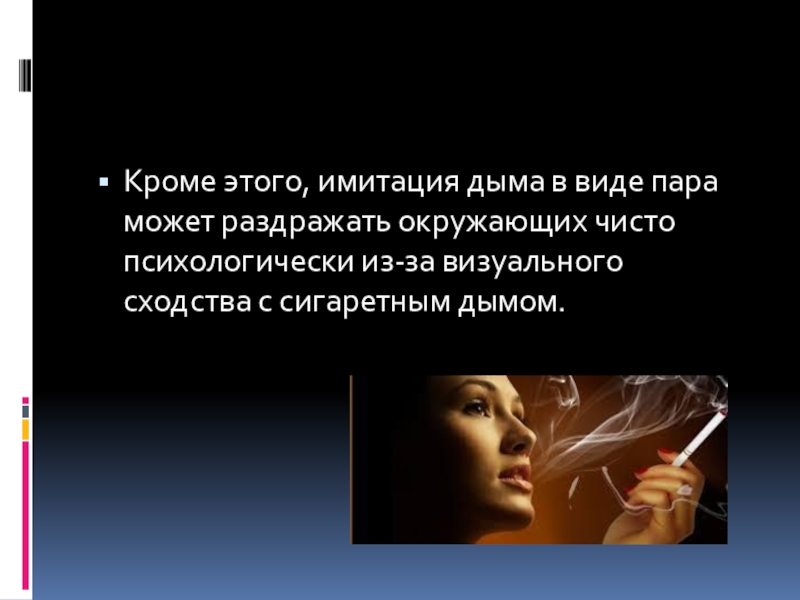 Слайд 11Кроме этого, имитация дыма в виде пара может раздражать окружающих чисто