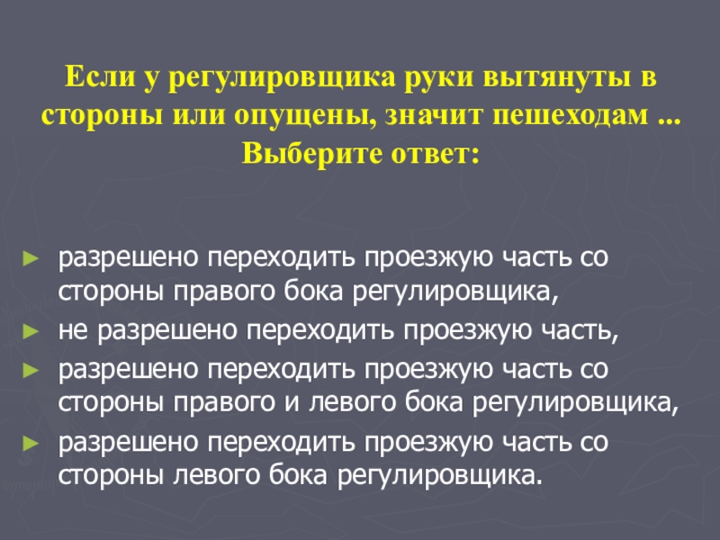 разрешено переходить проезжую часть со стороны правого и левого бока регулировщика,
