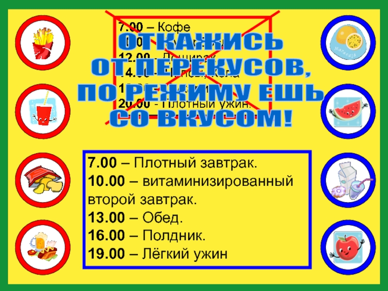 7.00 – Кофе 10.00 – Бутерброд 12.00 - Доширак 14.00 – Чипсы, Кола 18.00 – Сухарики 20.00 - Плотный ужин.