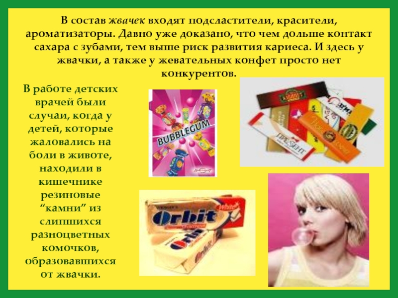 В работе детских врачей были случаи, когда у детей, которые жаловались на боли в животе, находили в кишечнике резиновые “камни” из слипшихся разноцветных комочков, образовавшихся от жвачки.