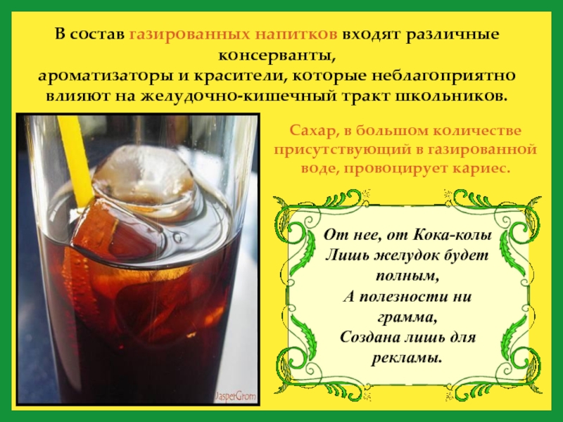 Сахар, в большом количестве присутствующий в газированной воде, провоцирует кариес.