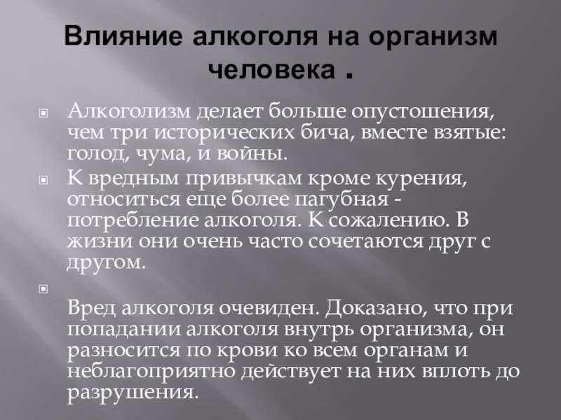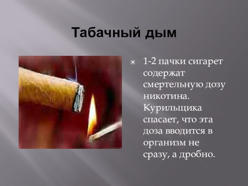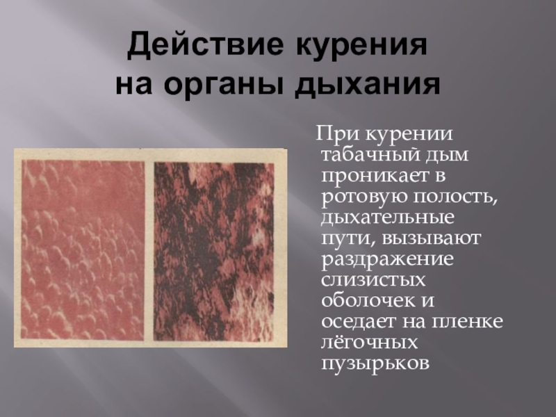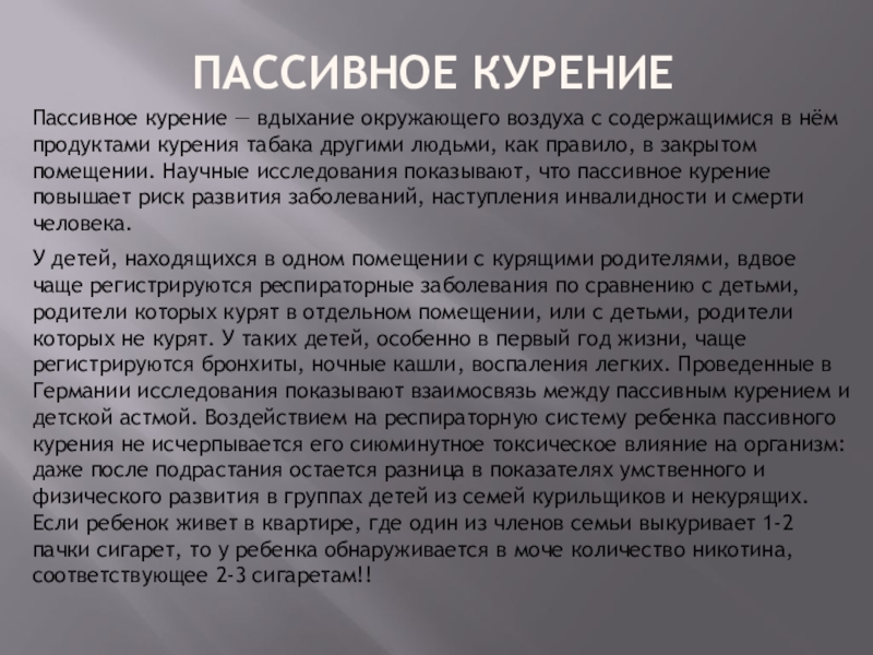 У детей, находящихся в одном помещении с курящими родителями, вдвое чаще регистрируются респираторные заболевания по сравнению с детьми, родители которых курят в отдельном помещении, или с детьми, родители которых не курят. У таких детей, особенно в первый год жизни, чаще регистрируются бронхиты, ночные кашли, воспаления легких. Проведенные в Германии исследования показывают взаимосвязь между пассивным курением и детской астмой. Воздействием на респираторную систему ребенка пассивного курения не исчерпывается его сиюминутное токсическое влияние на организм: даже после подрастания остается разница в показателях умственного и физического развития в группах детей из семей курильщиков и некурящих. Если ребенок живет в квартире, где один из членов семьи выкуривает 1-2 пачки сигарет, то у ребенка обнаруживается в моче количество никотина, соответствующее 2-3 сигаретам!!