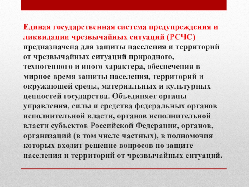 защиты населения и территорий от чрезвычайных ситуаций природного, техногенного и иного характера, обеспечения в мирное время защиты населения, территорий и окружающей среды, материальных и культурных ценностей государства. Объединяет органы управления, силы и средства федеральных органов исполнительной власти, органов исполнительной власти субъектов Российской Федерации, органов, организаций (в том числе частных), в полномочия которых входит решение вопросов по защите населения и территорий от чрезвычайных ситуаций.