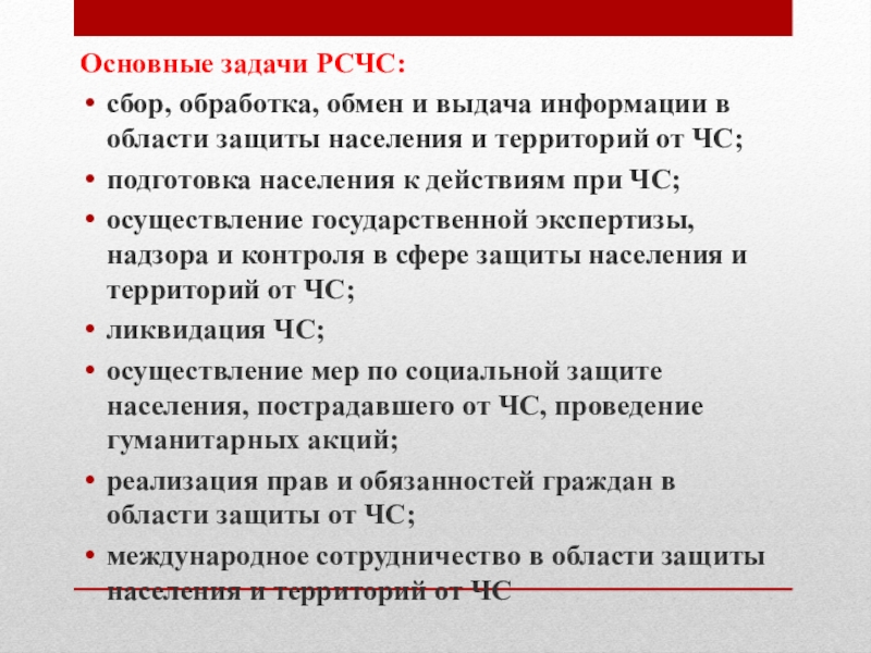 Основные задачи РСЧС:сбор, обработка, обмен и выдача информации в области защиты населения и территорий от ЧС;подготовка населения