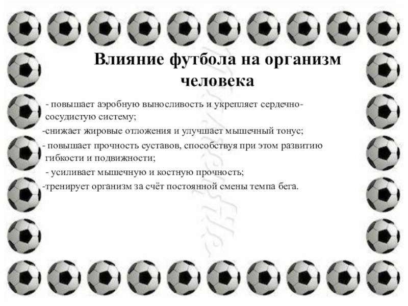 Слайд 26Влияние футбола на организм человека