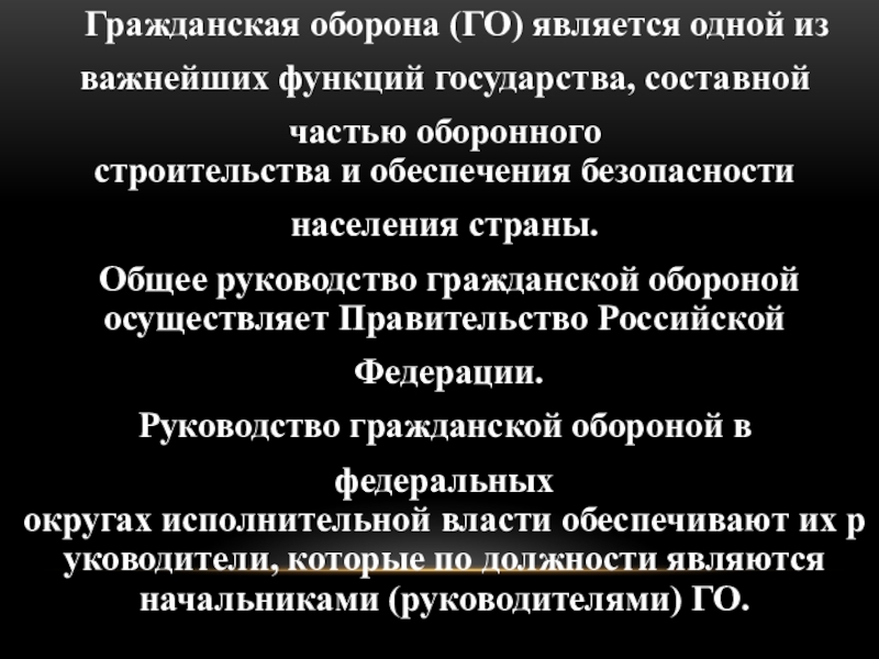 Гражданская оборона (ГО) является одной из важнейших функций государства, составной частью оборонного строительства и обеспечения безопасности населения страны. Общее руководство гражданской обороной осуществляет Правительство Российской Федерации. Руководство гражданской обороной в федеральных округах исполнительной власти обеспечивают их руководители, которые по должности являются начальниками (руководителями) ГО.