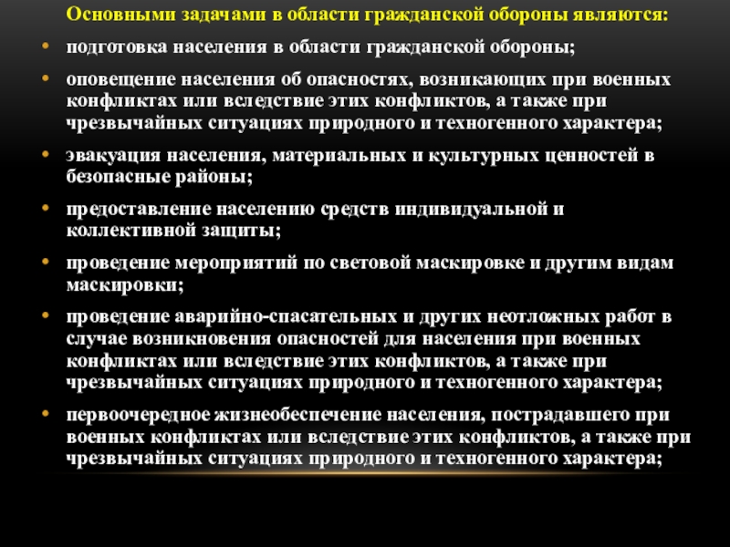 Основными задачами в области гражданской обороны являются:подготовка населения в области гражданской обороны;оповещение населения об опасностях, возникающих при