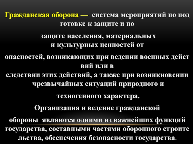 Гражданская оборона —  система мероприятий по подготовке к защите и по защите населения, материальных  и культурных ценностей от опасностей, возникающих при ведении военных действий или в следствии этих действий, а также при возникновении  чрезвычайных ситуаций природного и техногенного характера. Организация и ведение гражданской обороны  являются одними из важнейших функций государства, составными частями оборонного строительства, обеспечения безопасности государства.