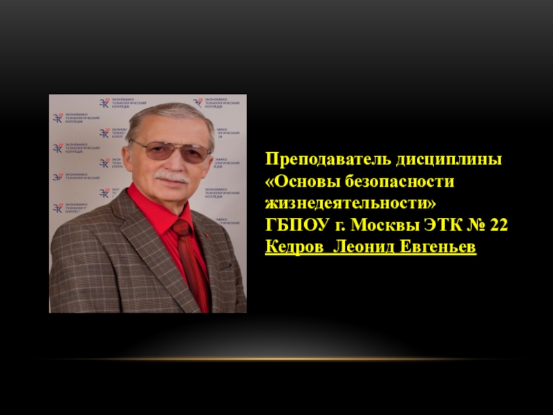 Слайд 2Преподаватель дисциплины «Основы безопасности жизнедеятельности» ГБПОУ г. Москвы ЭТК № 22 Кедров Леонид Евгеньев