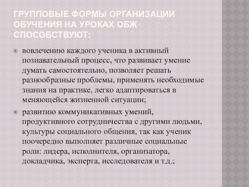 Слайд 2Групповые формы организации обучения на уроках ОБЖ способствуют: