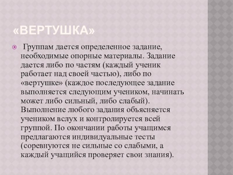 частям (каждый ученик работает над своей частью), либо по «вертушке» (каждое последующее задание выполняется следующим учеником, начинать может либо сильный, либо слабый). Выполнение любого задания объясняется учеником вслух и контролируется всей группой. По окончании работы учащимся предлагаются индивидуальные тесты (соревнуются не сильные со слабыми, а каждый учащийся проверяет свои знания).