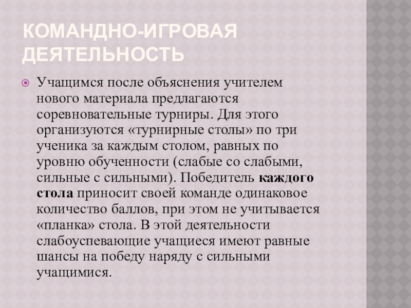 организуются «турнирные столы» по три ученика за каждым столом, равных по уровню обученности (слабые со слабыми, сильные с сильными). Победитель каждого стола приносит своей команде одинаковое количество баллов, при этом не учитывается «планка» стола. В этой деятельности слабоуспевающие учащиеся имеют равные шансы на победу наряду с сильными учащимися.