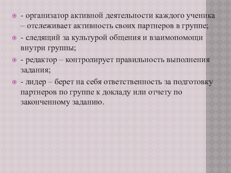 Слайд 8- организатор активной деятельности каждого ученика – отслеживает активность своих партнеров