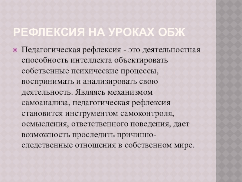 собственные психические процессы, воспринимать и анализировать свою деятельность. Являясь механизмом самоанализа, педагогическая рефлексия становится инструментом самоконтроля, осмысления, ответственного поведения, дает возможность проследить причинно-следственные отношения в собственном мире.