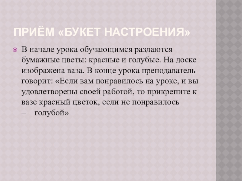 голубые. На доске изображена ваза. В конце урока преподаватель говорит: «Если вам понравилось на уроке, и вы удовлетворены своей работой, то прикрепите к вазе красный цветок, если не понравилось – голубой»