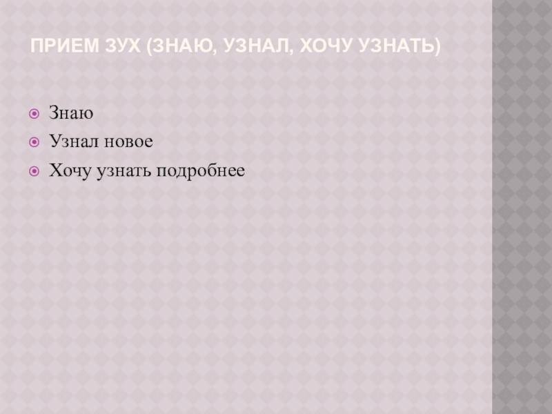 Слайд 22Прием ЗУХ (знаю, узнал, хочу узнать)