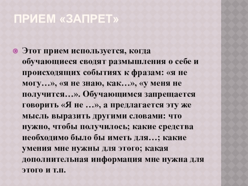 происходящих событиях к фразам: «я не могу…», «я не знаю, как…», «у меня не получится…». Обучающимся запрещается говорить «Я не …», а предлагается эту же мысль выразить другими словами: что нужно, чтобы получилось; какие средства необходимо было бы иметь для…; какие умения мне нужны для этого; какая дополнительная информация мне нужна для этого и т.п.