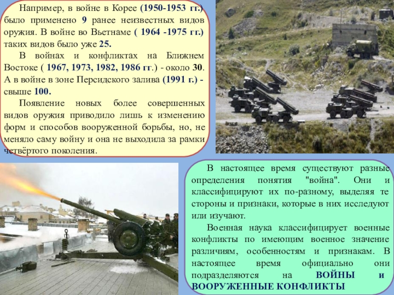 Анализируя опыт войн, военных и вооруженных конфликтов, имевших место только за последние 52 года, можно обнаружить смену закономерности в развитии вооружений: плавный, постепенный эволюционный процесс разработки и модернизации известных видов вооружений начал уступать место скачкообразному их обновлению.