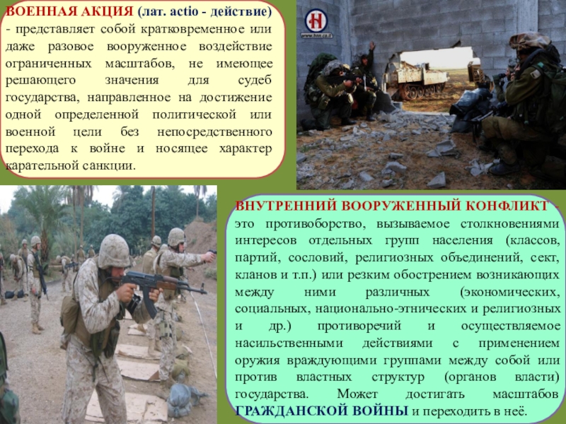ВНУТРЕННИЙ ВООРУЖЕННЫЙ КОНФЛИКТ - это противоборство, вызываемое столкновениями интересов отдельных групп населения (классов, партий, сословий, религиозных объединений, сект, кланов и т.п.) или резким обострением возникающих между ними различных (экономических, социальных, национально-этнических и религиозных и др.) противоречий и осуществляемое насильственными действиями с применением оружия враждующими группами между собой или против властных структур (органов власти) государства. Может достигать масштабов ГРАЖДАНСКОЙ ВОЙНЫ и переходить в неё.