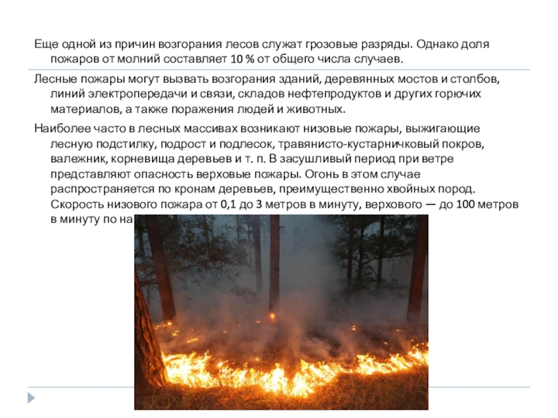Слайд 19Еще одной из причин возгорания лесов служат грозовые разряды. Однако доля