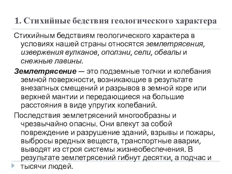 Последствия землетрясений многообразны и чрезвычайно опасны. Они влекут за собой повреждение и разрушение зданий, взрывы и пожары, выбросы вредных веществ, транспортные аварии, выводят из строя системы жизнеобеспечения. В результате землетрясений гибнут десятки, а подчас и тысячи людей.
