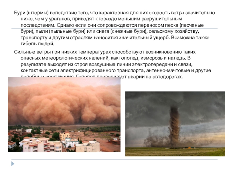 ниже, чем у ураганов, приводят к гораздо меньшим разрушительным последствиям. Однако если они сопровождаются переносом песка (песчаные бури), пыли (пыльные бури) или снега (снежные бури), сельскому хозяйству, транспорту и другим отраслям наносится значительный ущерб. Возможна также гибель людей.