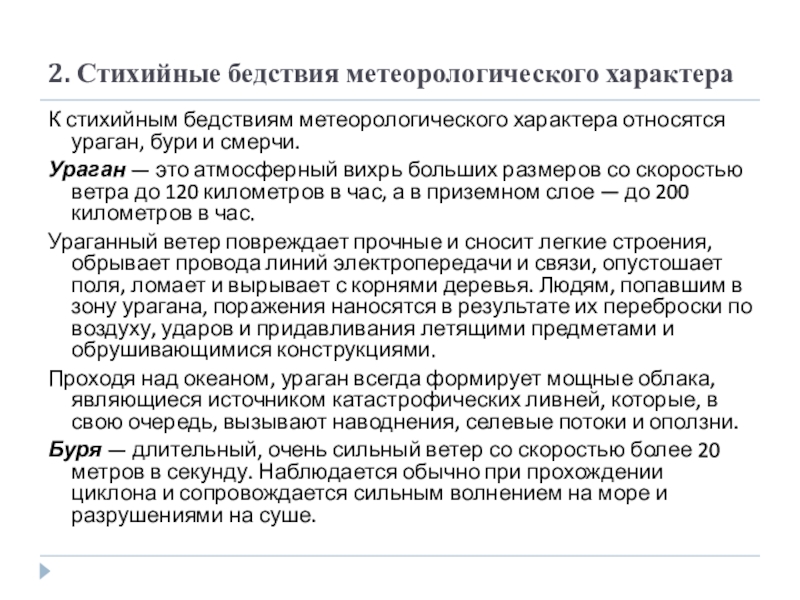 К стихийным бедствиям метеорологического характера относятся ураган,