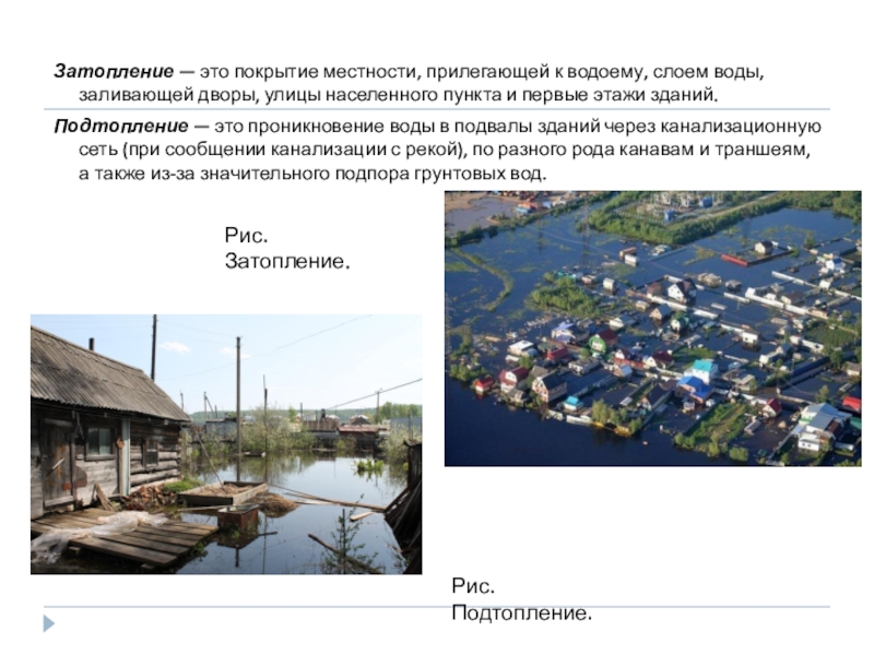 Слайд 16Затопление — это покрытие местности, прилегающей к водоему, слоем воды, заливающей