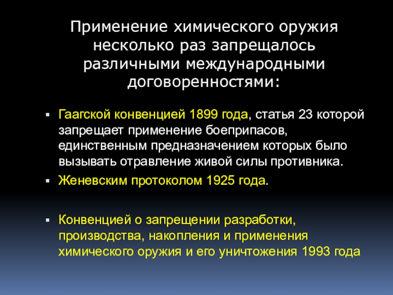 Применение химического оружия несколько раз запрещалось различными международными договоренностями: