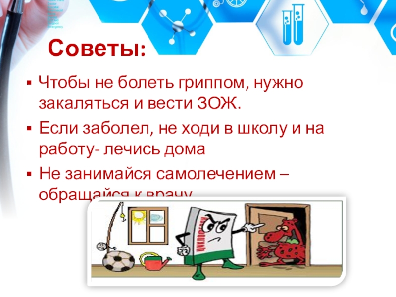 Чтобы не болеть гриппом, нужно закаляться и вести ЗОЖ.
