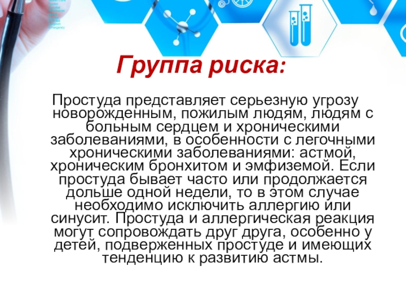 сердцем и хроническими заболеваниями, в особенности с легочными хроническими заболеваниями: астмой, хроническим бронхитом и эмфиземой. Если простуда бывает часто или продолжается дольше одной недели, то в этом случае необходимо исключить аллергию или синусит. Простуда и аллергическая реакция могут сопровождать друг друга, особенно у детей, подверженных простуде и имеющих тенденцию к развитию астмы.