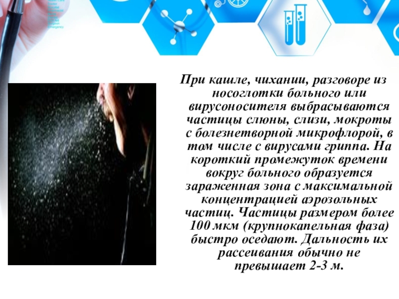частицы слюны, слизи, мокроты с болезнетворной микрофлорой, в том числе с вирусами гриппа. На короткий промежуток времени вокруг больного образуется зараженная зона с максимальной концентрацией аэрозольных частиц. Частицы размером более 100 мкм (крупнокапельная фаза) быстро оседают. Дальность их рассеивания обычно не превышает 2-3 м.
