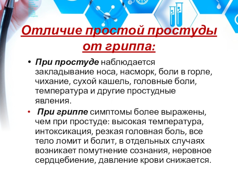 При гриппе симптомы более выражены, чем при простуде: высокая температура, интоксикация, резкая головная боль, все тело ломит и болит, в отдельных случаях возникает помутнение сознания, неровное сердцебиение, давление крови снижается.
