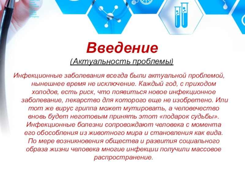 Каждый год, с приходом холодов, есть риск, что появиться новое инфекционное заболевание, лекарство для которого еще не изобретено. Или тот же вирус гриппа может мутировать, а человечество вновь будет неготовым принять этот «подарок судьбы». Инфекционные болезни сопровождают человека с момента его обособления из животного мира и становления как вида. По мере возникновения общества и развития социального образа жизни человека многие инфекции получили массовое распространение.