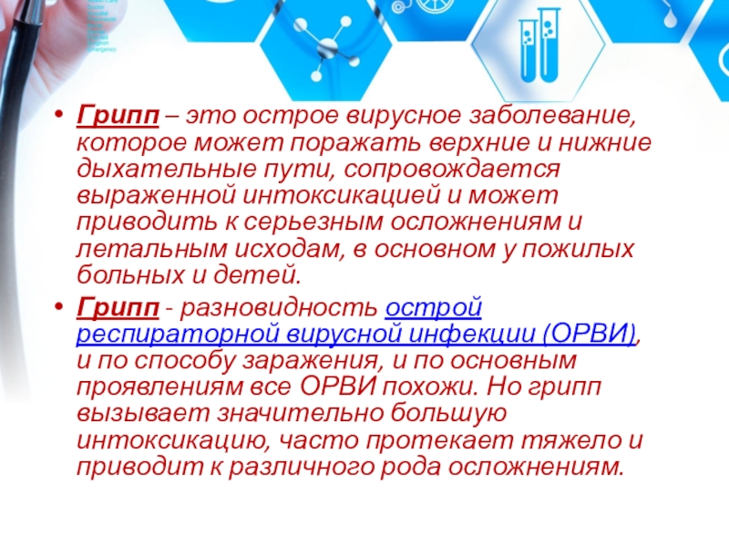 Слайд 18Грипп – это острое вирусное заболевание, которое может поражать верхние и