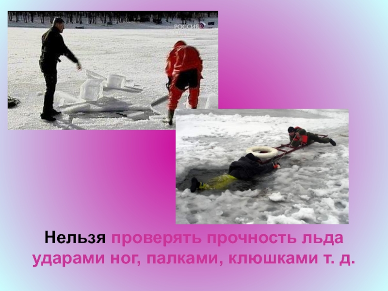 Слайд 6Нельзя проверять прочность льда ударами ног, палками, клюшками т. д.