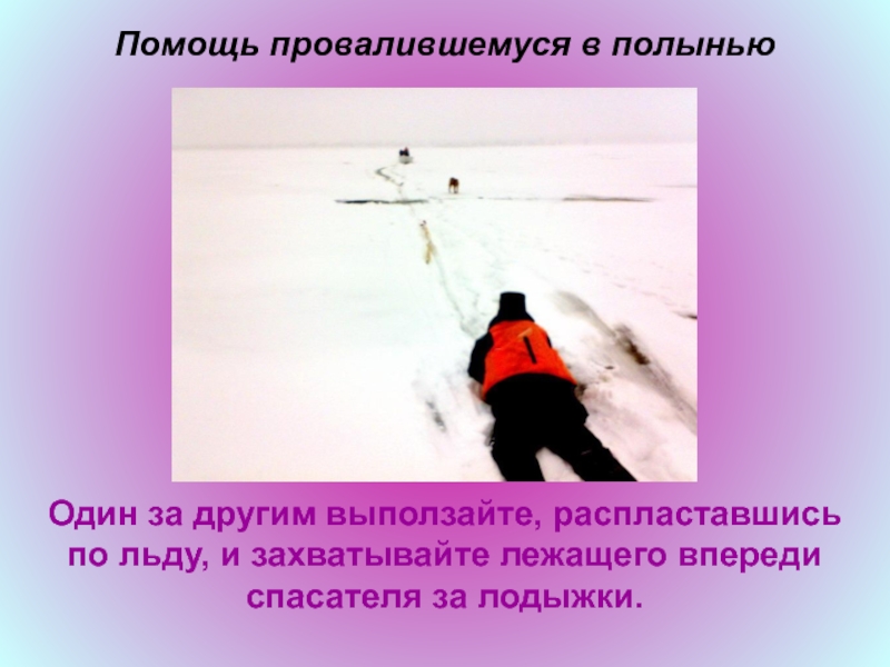 плашмя, не позволяйте ему встать на ноги и идти по льду