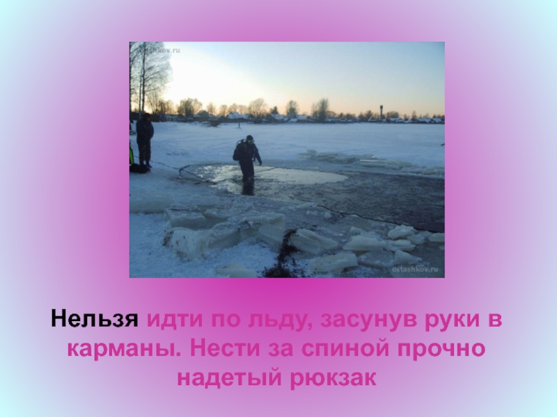 Слайд 8Нельзя идти по льду, засунув руки в карманы. Нести за спиной