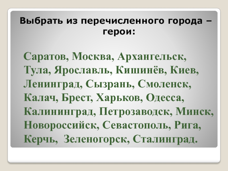 Слайд 53Выбрать из перечисленного города – герои: