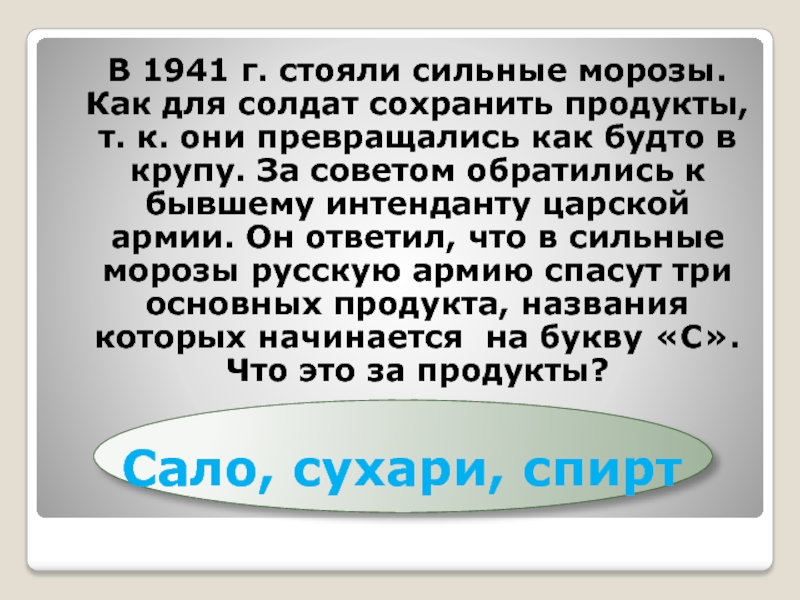 солдат сохранить продукты, т. к. они превращались как будто в крупу. За советом обратились к бывшему интенданту царской армии. Он ответил, что в сильные морозы русскую армию спасут три основных продукта, названия которых начинается на букву «С». Что это за продукты?