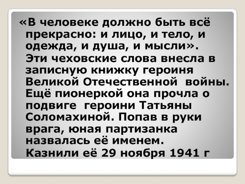Эти чеховские слова внесла в записную книжку героиня Великой Отечественной войны. Ещё пионеркой она прочла о подвиге героини Татьяны Соломахиной. Попав в руки врага, юная партизанка назвалась её именем.