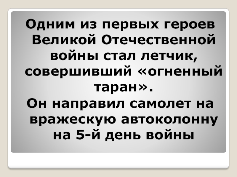 Слайд 35Одним из первых героев Великой Отечественной войны стал летчик, совершивший «огненный