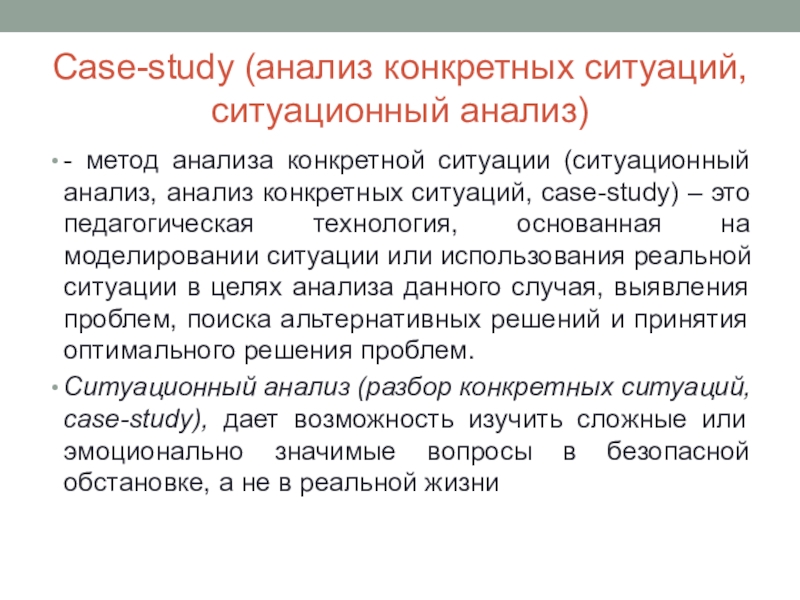 Ситуационный анализ (разбор конкретных ситуаций, case-study), дает возможность изучить сложные или эмоционально значимые вопросы в безопасной обстановке, а не в реальной жизни