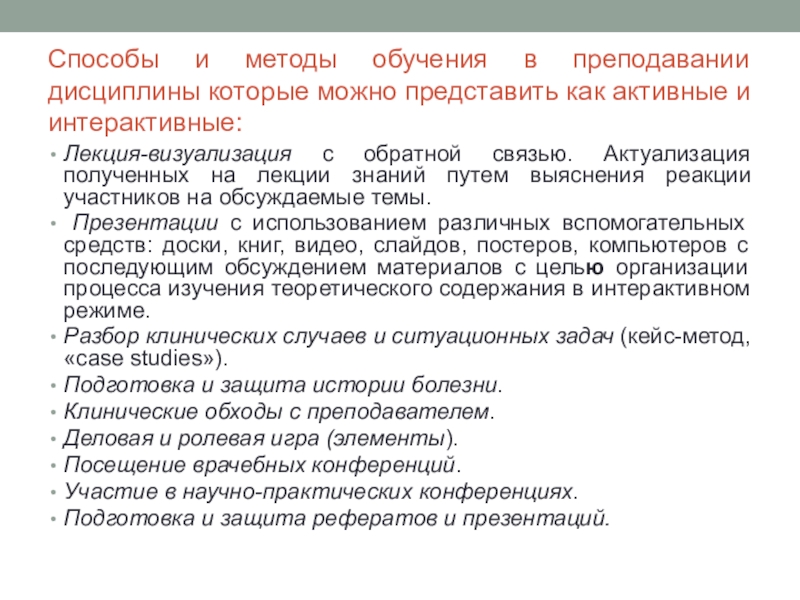 Презентации с использованием различных вспомогательных средств: доски, книг, видео, слайдов, постеров, компьютеров с последующим обсуждением материалов с целью организации процесса изучения теоретического содержания в интерактивном режиме.